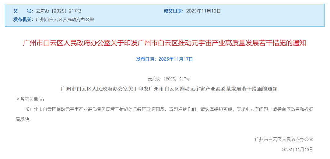 11月,白云区印发《推动元宇宙产业高质量发展若干措施》,千万元级扶持政策重磅落地。政策覆盖研发补助、产品补贴、载体扶持等全链条,单个项目最高资助1000万元,智能终端生产企业最高奖励500万元。更值得关注的是,元宇宙产业发展专班已在设计之都实体化运行,精准对接35家领军企业,联动高校、资本构建协同生态,推动元宇宙技术与设计、文旅等产业深度融合。