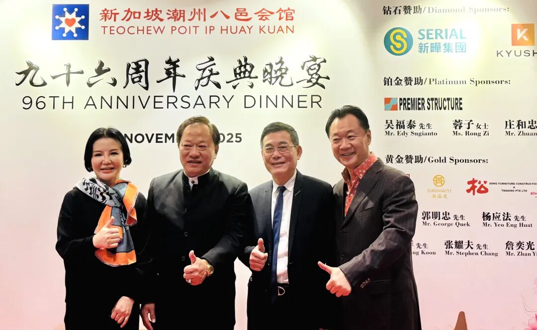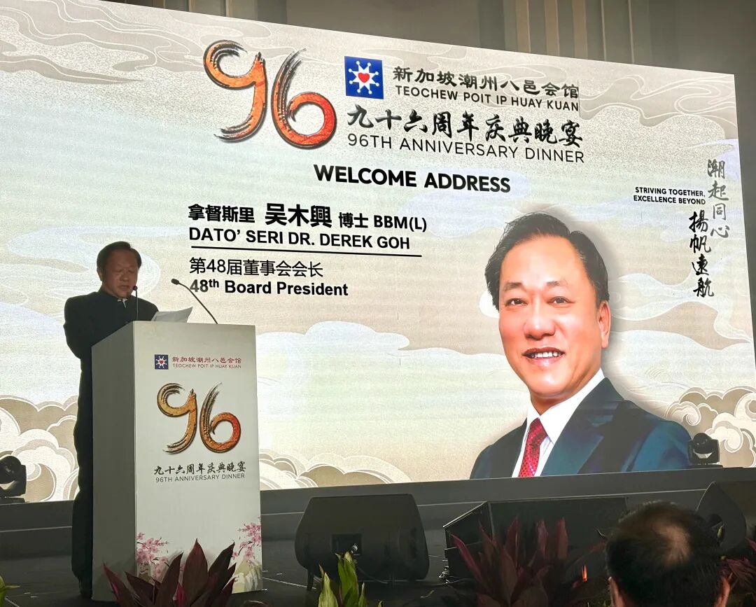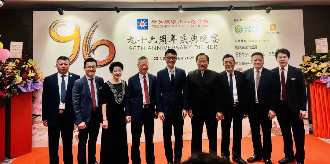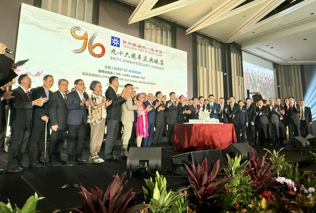 新加坡潮州八邑会馆96周年庆典晚宴于当地时间11月23日在莱佛士城会议中心四楼费尔蒙宴会厅举行,近900名宾客出席,包括海外80余位潮属社团及商界领袖、新加坡本地政治领袖、驻新外交使节等。新加坡潮州八邑会馆会长、拿督斯里吴木兴博士主持,新加坡国家发展部长徐芳达任主宾,前副总理王瑞杰(会馆荣誉顾问)、会馆顾问郭明忠、国会议长谢健平等出席。晚宴上,吴木兴宣布会馆获2027年第24届国际潮团联谊年会主办权,这也是全球唯一主办三届该年会的潮团组织,将率百人代表团于11月26日赴潮州出席第23届年会并接旗。